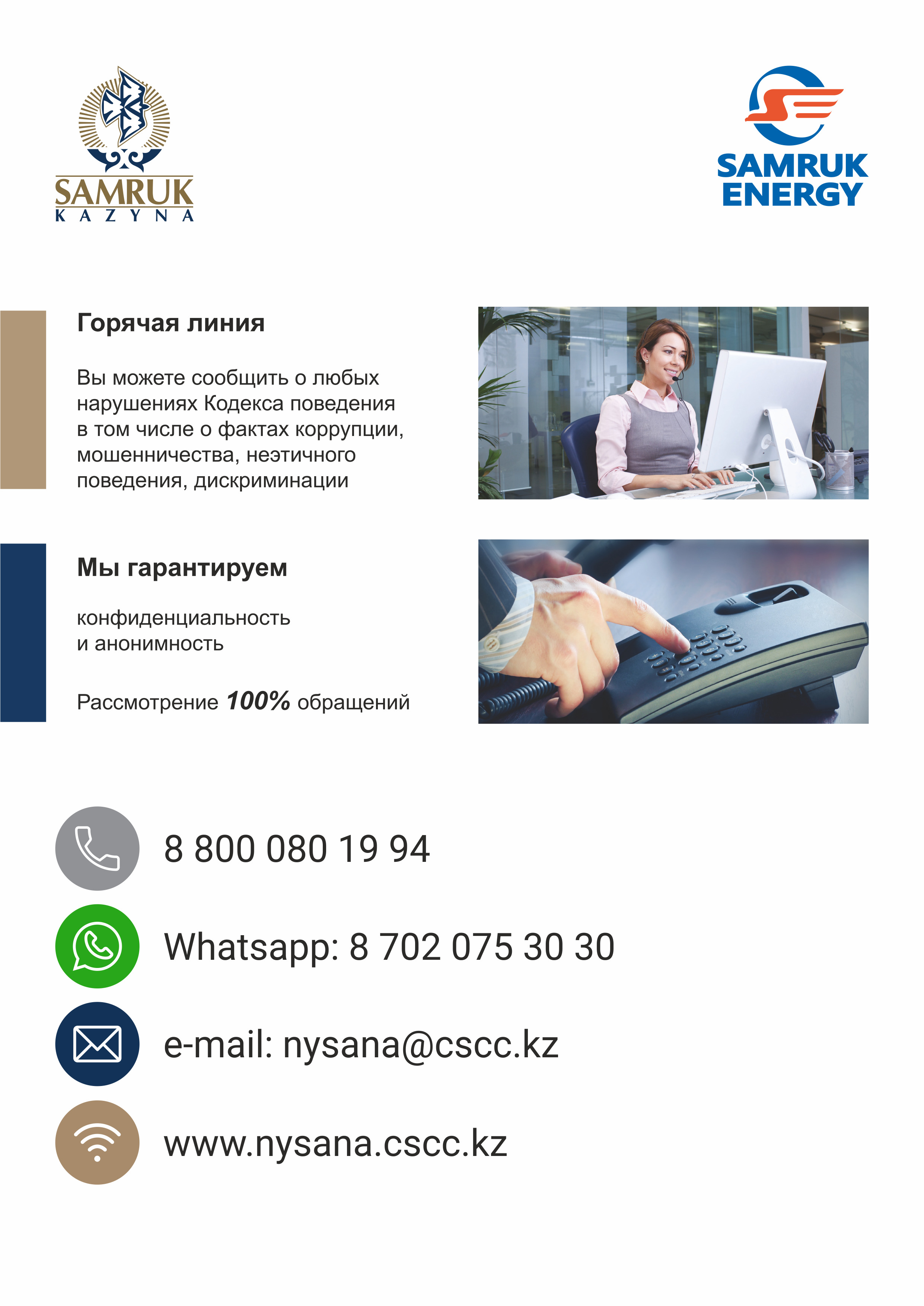 ✔ В типовые договоры по всей группе компаний АО «Самрук-Энерго» включены антикоррупционные оговорки – предусматривающие обязательства поставщиков соблюдать законодательство Республики Казахстан по вопросам противодействия коррупции, а также информировать заказчика о любых предполагаемых и фактических нарушениях антикоррупционного законодательства и правил закупок посредством горячей линии.