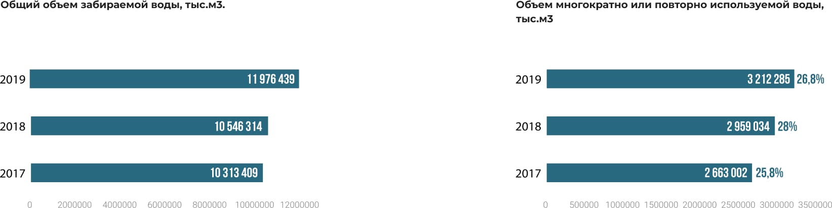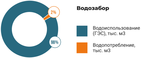 В производственной деятельности компаний группы АО «Самрук-Энерго» этот возобновляемый природный ресурс используется как сила, позволяющая раскрутить ротор генератора для выработки электроэнергии на ГЭС и ТЭС, а также как теплоноситель при переносе и передаче тепловой энергии на ТЭЦ и котельных. Кроме того, вода применяется на подпитку водохранилищ, на орошение зольных пляжей, на поддержание уровня воды в золоотвалах, на коммунально-бытовые нужды. Учитывая тот факт, что в портфеле АО «Самрук-Энерго» имеются и гидроэлектростанции, и тепловые электростанции, наше взаимодействие с водой мы подразделяем на водопользование и водопотребление соответственно. При этом, 98,5 % объема забираемой воды классифицируется как водопользование на ГЭС, а 2 % – как водопотребление.