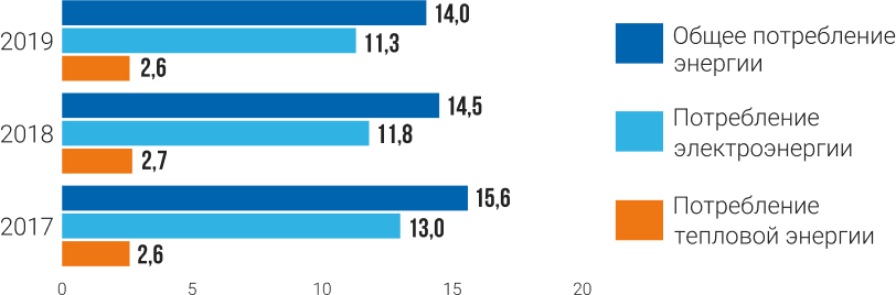 Общее потребление энергии имеет устойчивую динамику снижения по отношению к базовому 2014 году (17,7 млн. ГДж), как по потреблению электрической энергии, так и по потреблению тепловой энергии. В отчетном году было потреблено 14,0 млн. ГДж энергии, в том числе от возобновляемых источников энергии 1,3 млн. ГДж.