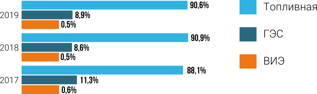 По итогам 2019 года распределение по видам генерации (традиционная, ГЭС и ВИЭ) выглядит следующим образом: