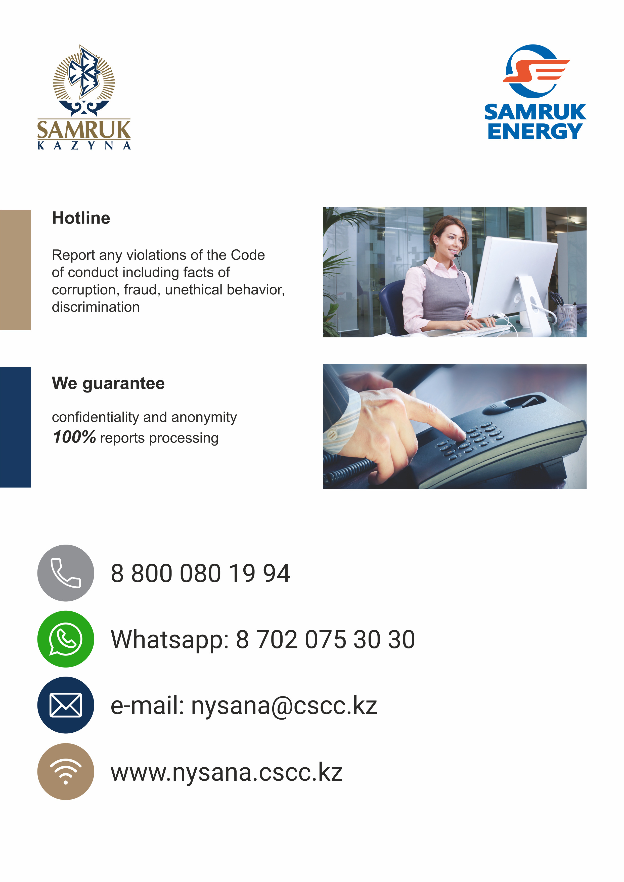 ✔ Anticorruption provisions stipulating obligations of suppliers to comply with the laws of the Republic of Kazakhstan on anti-corruption issues, as well as obligations on inform the customer of any alleged and actual violations of anti-corruption laws and procurement rules through the hotline were included in standard agreements across “Samruk-Energy” JSC group.