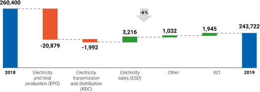 The main decrease occurred at “Ekibastuz GRES- 1” LLP because of a decrease in electricity sales volume from 18,340 mln. kWh to 17,642 mln. kWh and a decrease in the average tariff from 6,86 tenge / kWh to 6,07 tenge / kWh.