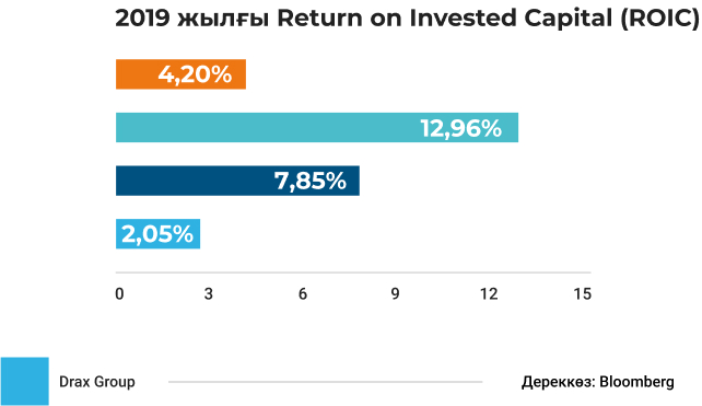 Сонымен қатар, EBITDA margin көрсеткіші бойынша, «Самұрық-Энерго» өзінің ұқсас компанияларынан басым түседі. Бұл көрсеткіш сатудан түсетін кірістің жоғары екенін көрсетеді. ROIC (салынған ұзақ мерзімді капиталдың рентабельділігі) көрсеткіші бойынша Самұрық-Энерго өзге еуропалық ұқсас компаниялардың деңгейінде. Десек те, осы көрсеткіш бойынша «Самұрық-Энерго» АҚ қызметінің экономикалық талаптары ұқсас келетін ресейлік холдингтен едәуір төмен деңгейде, бұл инвестициялардың тиімділігін (рентабельділігін, қайтарымдылығын)