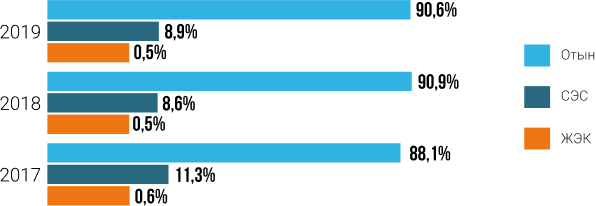 2019 жылғы қорытындылар бойынша өндіріс түрлері бойынша (дәстүрлі, СЭС және ЖЭК) үлестіру төмендегідей көрінеді: