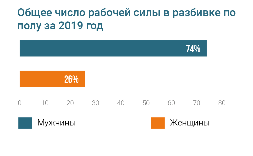 В соответствии с производственной спецификой деятельности АО «Самрук-Энерго» на основных участках производства задействованы работники мужского пола, доля которых от общей численности персонала в 2019 году составила 74 %. Совместно с ЕБРР и Ergon Associates в АО «Самрук-Энерго» стартовал проект, в рамках которого было подписано Заявление о поддержке 7 Принципов расширения прав и возможностей женщин, разработанных в рамках партнерства «ООН-женщины» и Глобального договора Организации Объединенных Наций.