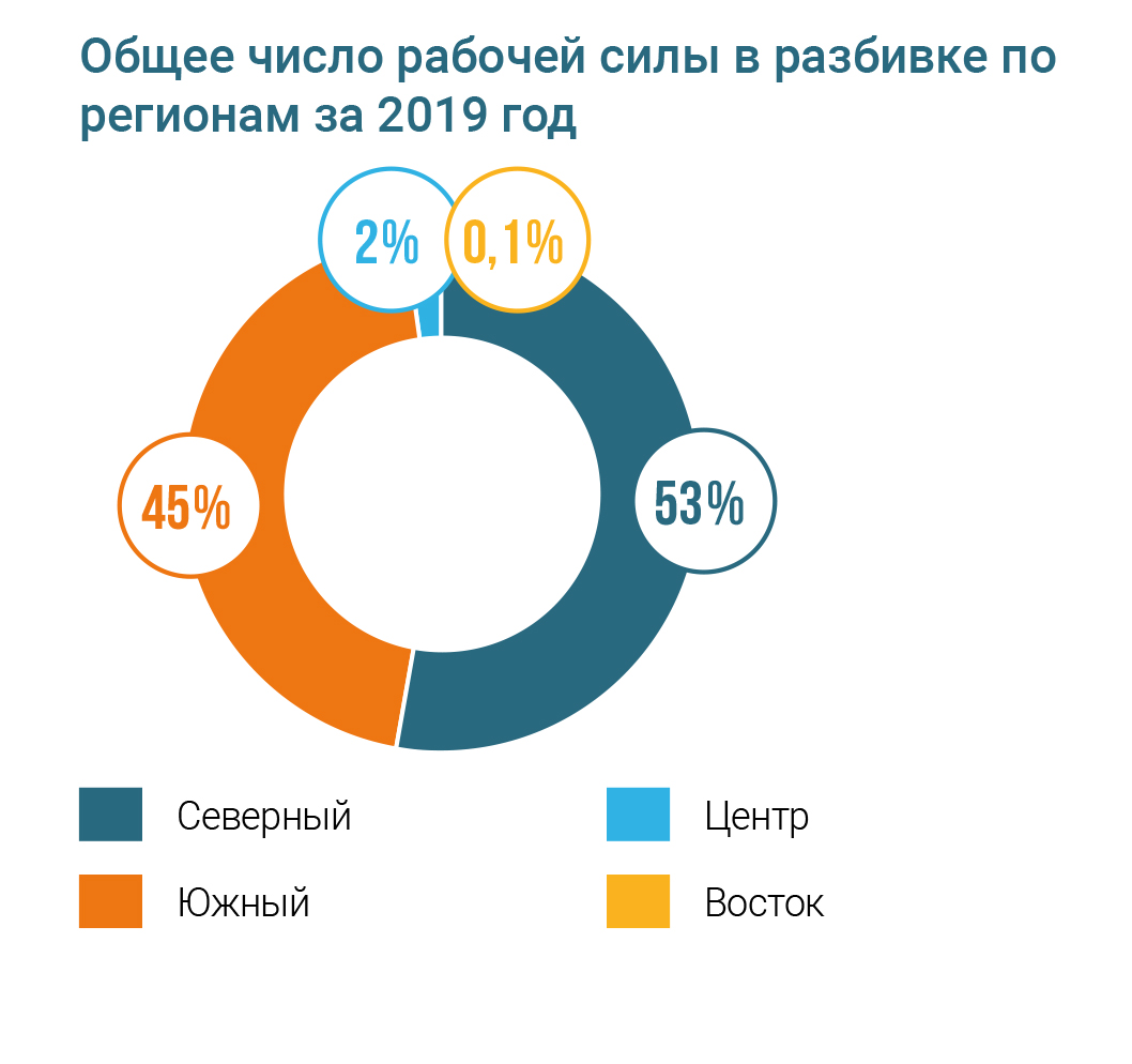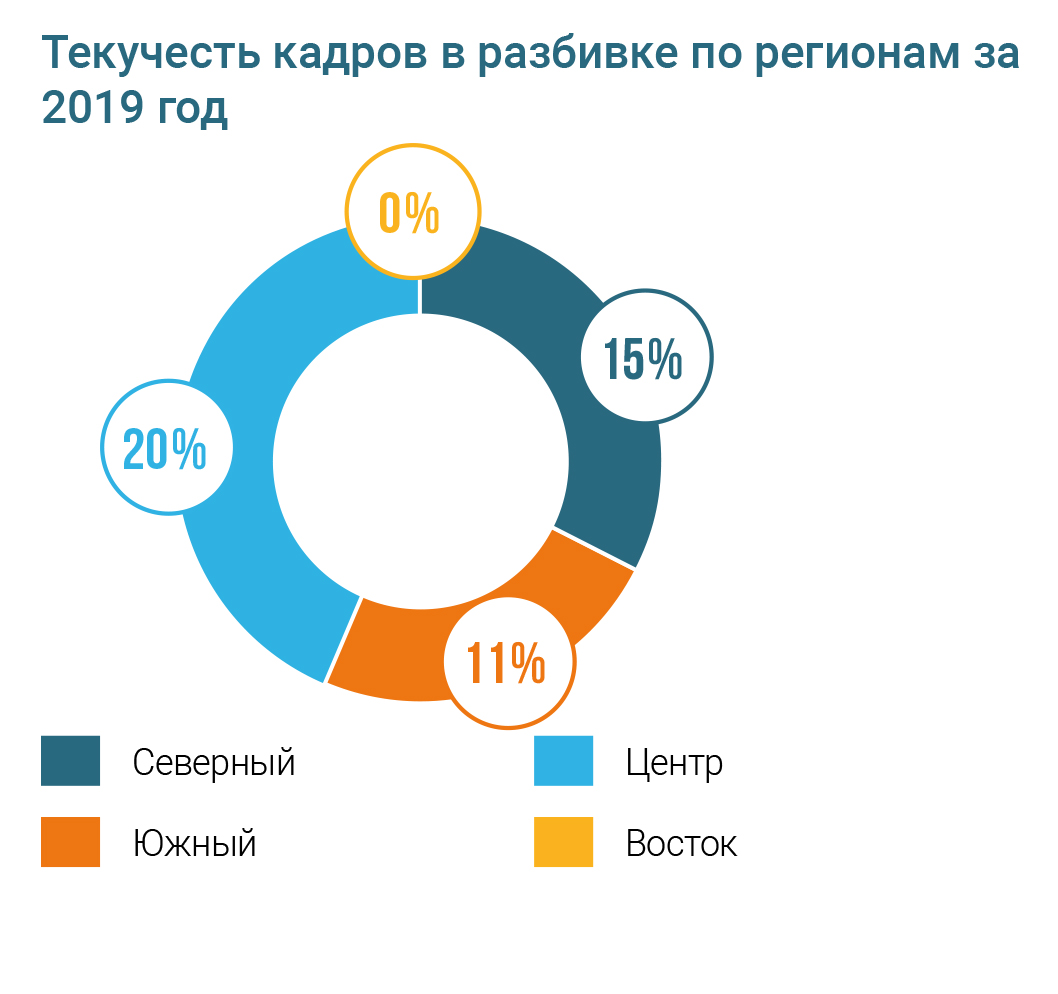 Доля руководителей высшего ранга в существенных регионах осуществления деятельности организации, нанятых из числа представителей местного населения – 96% В 2019 году коэффициент текучести кадров составил 9%. Основные причины – перспектива получения более высокой зарплаты в другом месте и отсутствие карьерного и профессионального развития и обучения.